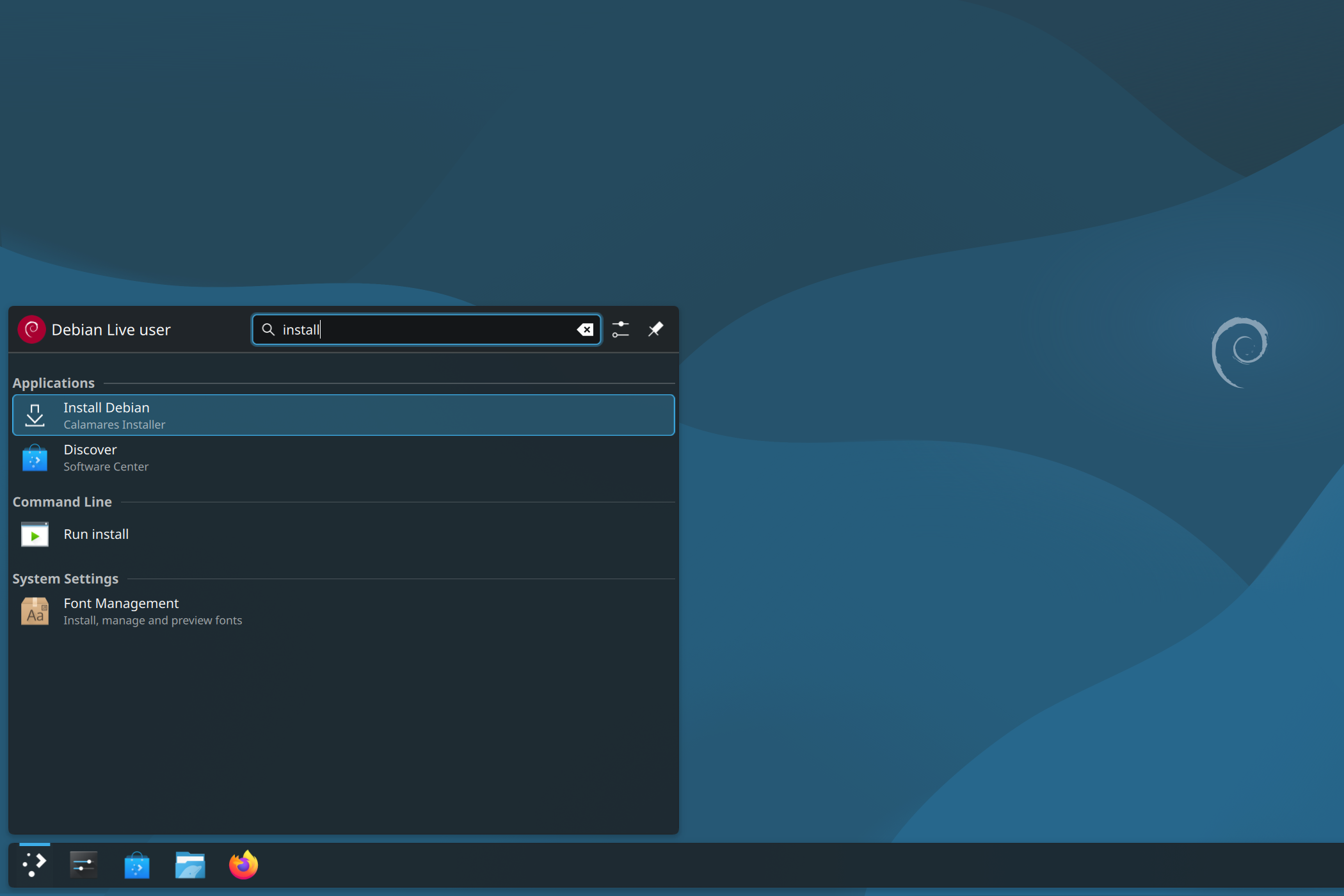 - If “Install Debian” is not present on the desktop, you may also access it using the Application Launcher: