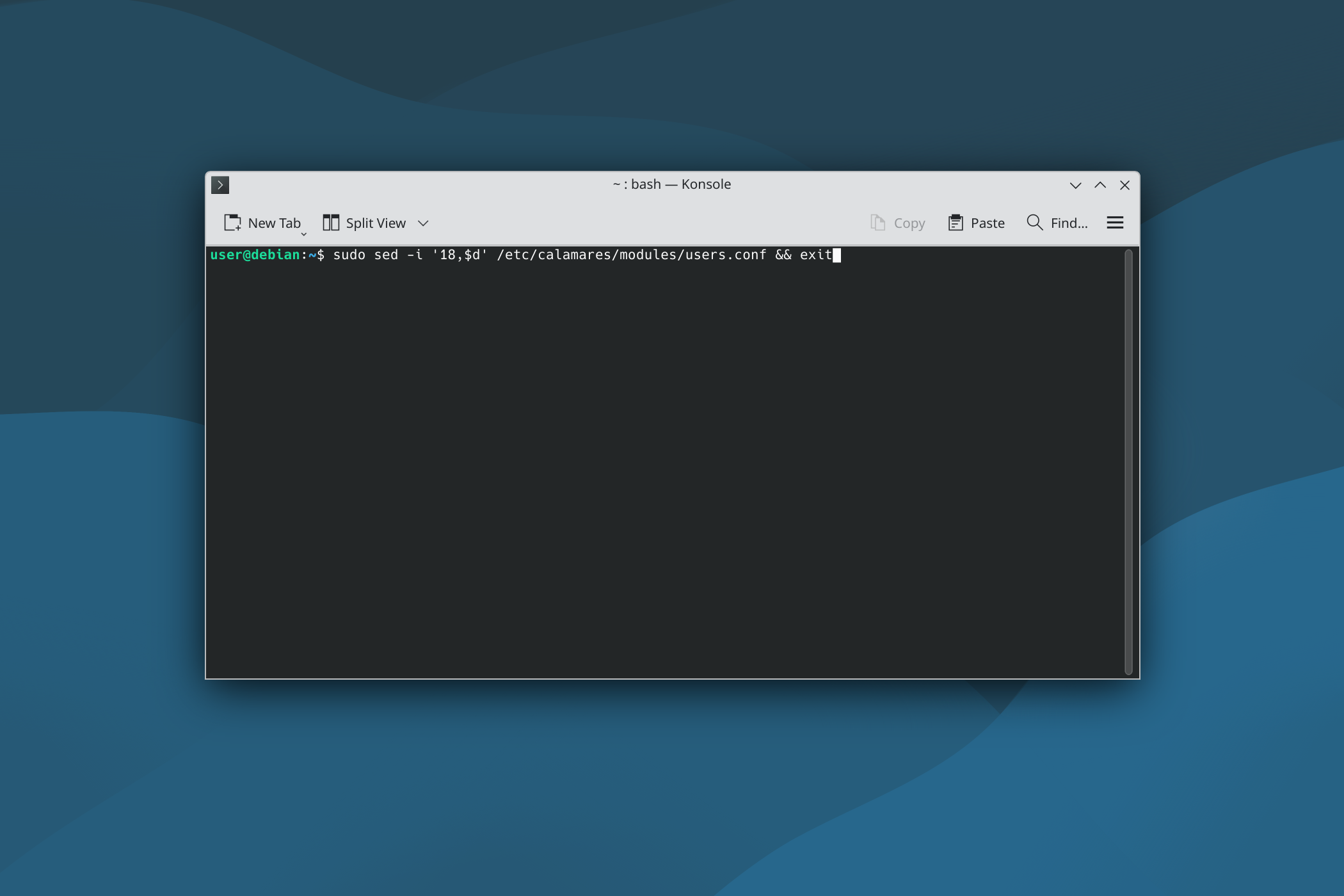 sudo sed -i '18,$d' /etc/calamares/modules/users.conf && exit